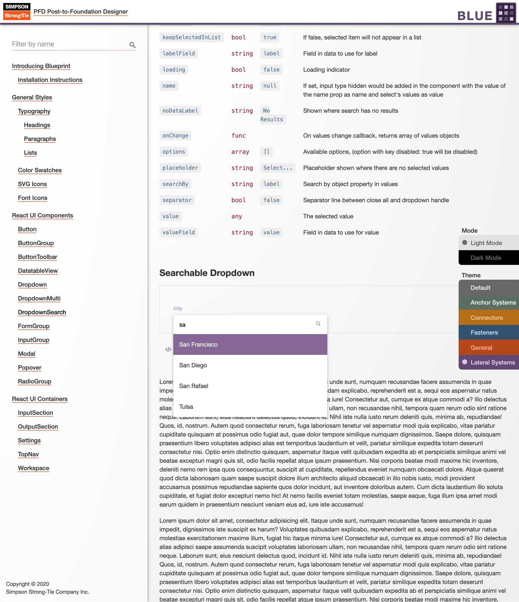 The Blueprint framework’s styles, icons, and React components are presented within a style guide built on the React Styleguidist library utilizing markdown files. The style guide displays the props and api for each component as well as a hot-loadable playground allowing front-end engineers to play with code snippets independent of actual applications.