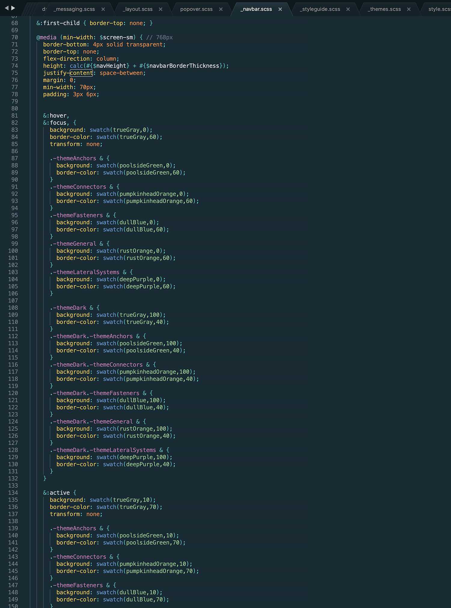 The framework UI was built with SCSS utilizing a top-down architecture using a small set of modifier classes the applied <html> tag to allow theming, modes as well as other customizations for branding. We chose this approach as opposed to an external theme .SCSS file due to the small size of the engineering team.