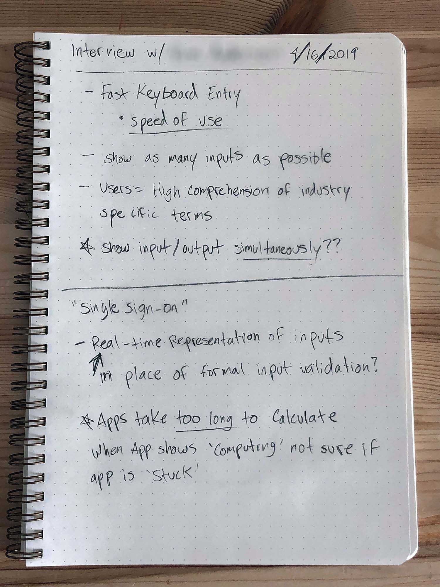 Prior to user research, the design team was tasked with creating an initial comprehensive layout to explore hypotheses regarding better user flows and interactions with the application. The rationale for this pre-research process was an aggressive timeline for the start of the application development once engineering resources became available in summer 2019. This process was quick and dirty and comprised mainly of whiteboard wireframe sketches which were used to try and tackle some of the more pressing issues such as the input/output relationship and the proper abstraction of input sections to work in a mobile context.