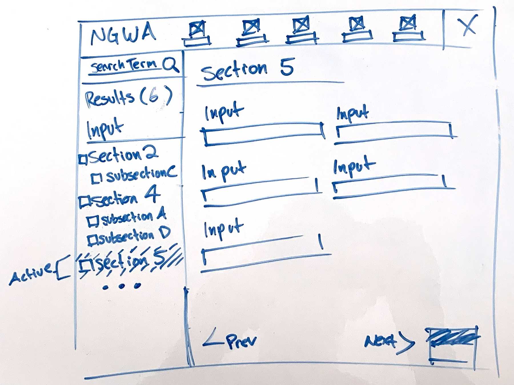 We discovered the majority of inputs and outputs could be chunked into similar sections which allowed for abstraction through pagination. This method of solving linear, long form processes was similar to the approach Turbo Tax used. At this time, we felt pagination would focus the user on a small set of form inputs that could be well represented on a mobile device. Apps would have a limited number of inputs per screen (6 or less was a number we thought to be a good starting point). Additional inputs will be abstracted into additional sections or chapters depending upon their hierarchy and importance.